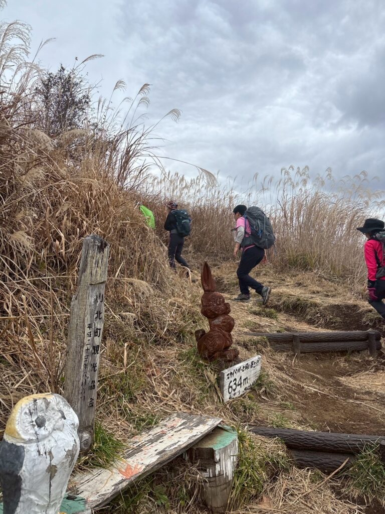 枯れススキの中 あっという間に山頂です。小田原市内が眼下に広がります。